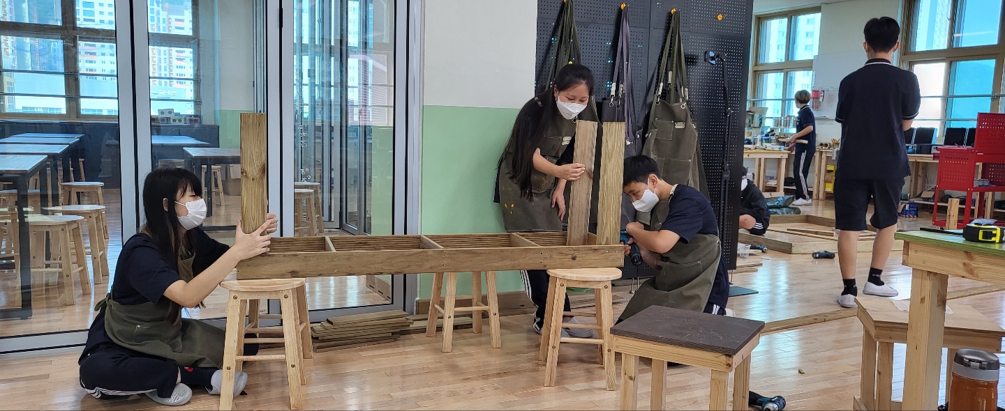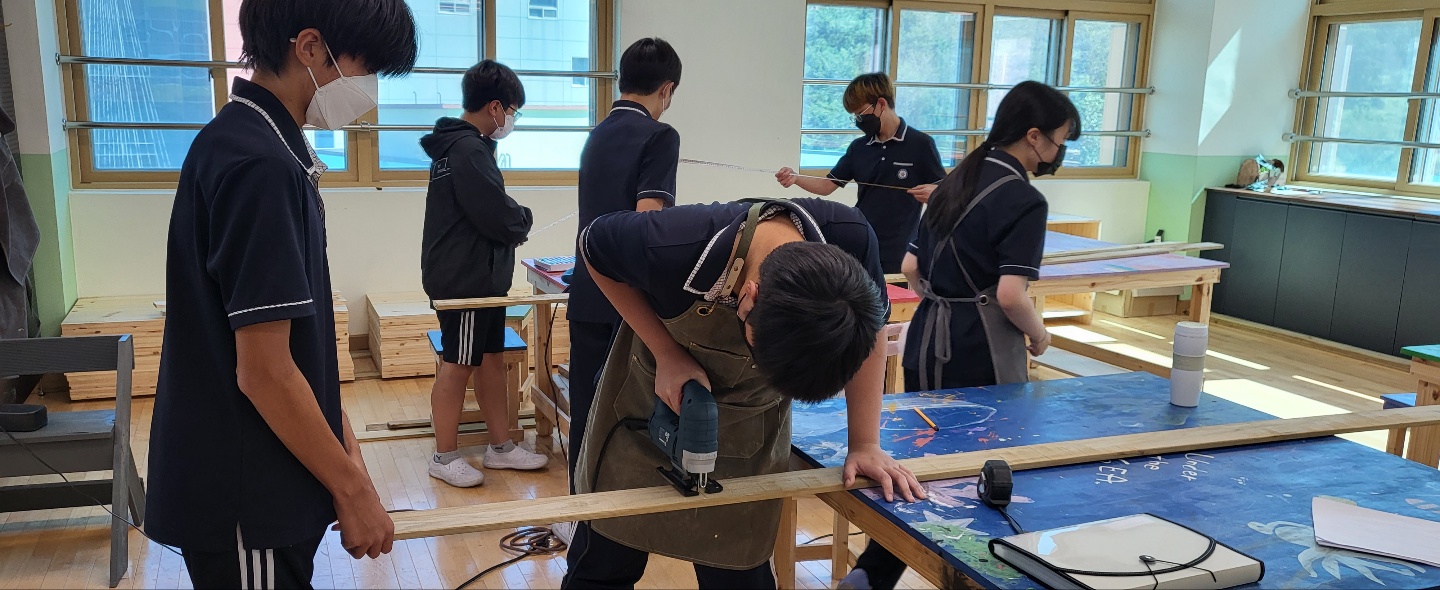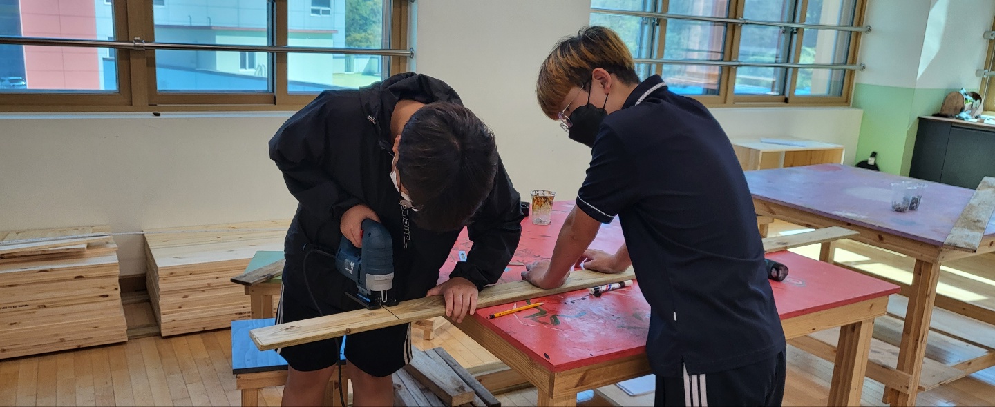 1학년 자유학기 예술 체육 활동 목공반 수업 사진입니다.